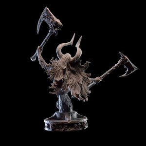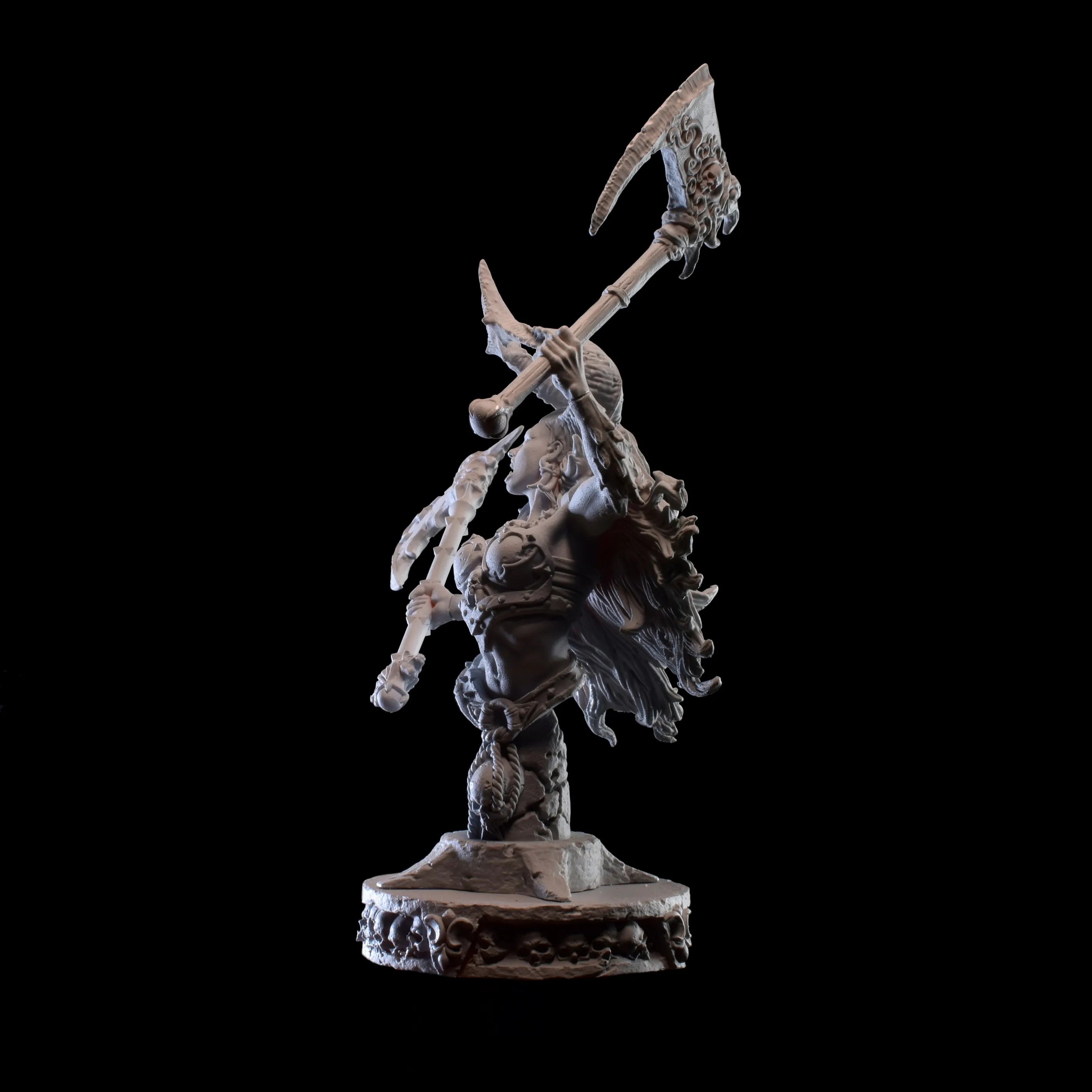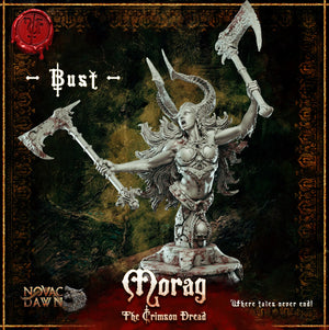 Standing almost a full three meters in height, Morag conquers everything in her path. She has monster blood in her veins, although no one knows what kind for certain. Her sire is as much of a mystery to her as everyone else. She has the strength of ten men and has been known to cut through armies with the dual battleaxes that she wields. Her heavy, dark horns threaten to pierce the sky. They are the first thing often spotted on the horizon and the last thing a man sees when she charges towards him, head-down. She uses her horns to gore enemies before slicing through them with her blades. No hunter has ever succeeded in taking her down. To all, she appears invincible.