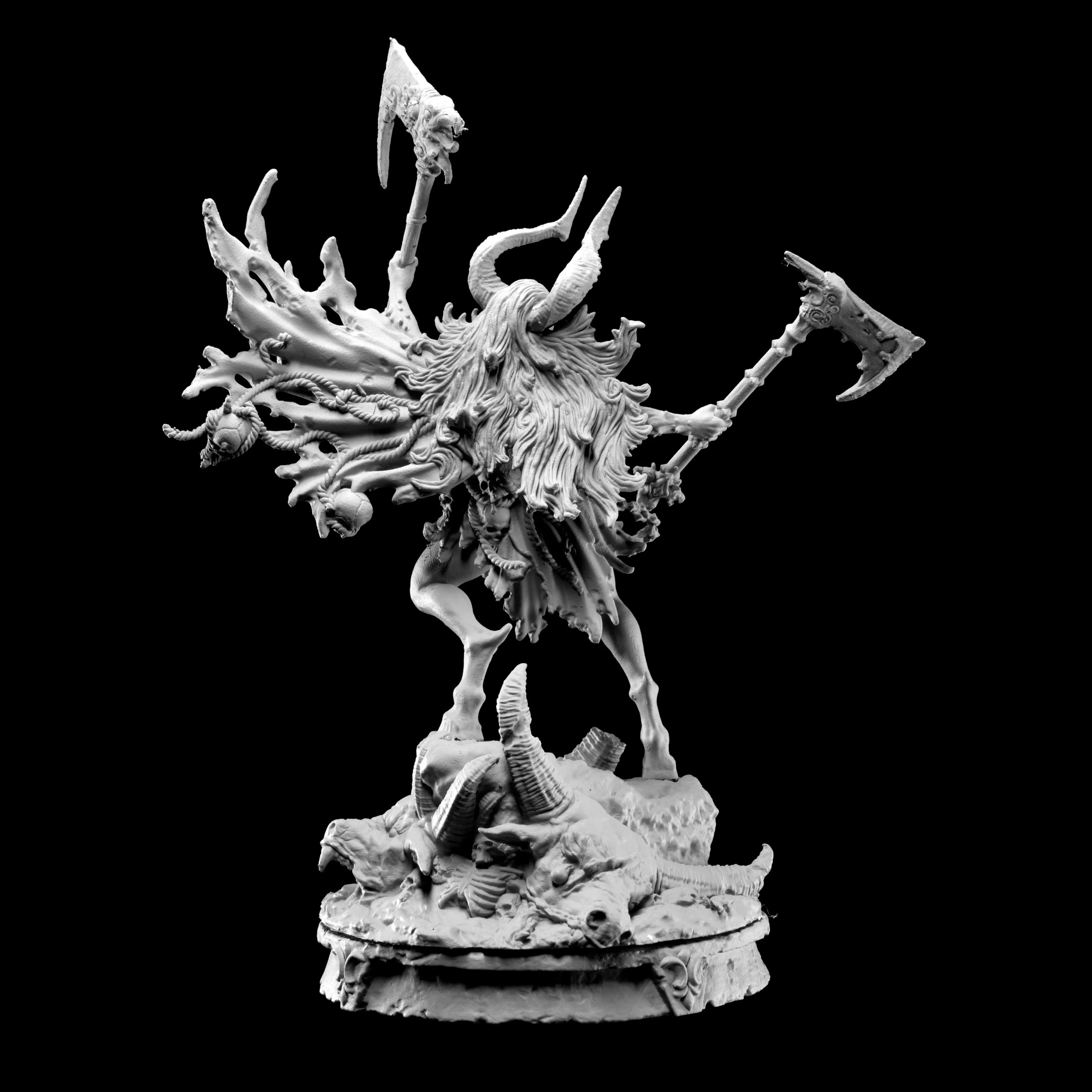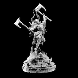 "Standing almost a full three meters in height, Morag conquers everything in her path. She has monster blood in her veins, although no one knows what kind for certain. Her sire is as much of a mystery to her as everyone else. She has the strength of ten men and has been known to cut through armies with the dual battleaxes that she wields. Her heavy, dark horns threaten to pierce the sky. They are the first thing often spotted on the horizon and the last thing a man sees when she charges towards him, head-down. She uses her horns to gore enemies before slicing through them with her blades. No hunter has ever succeeded in taking her down. To all, she appears invincible."