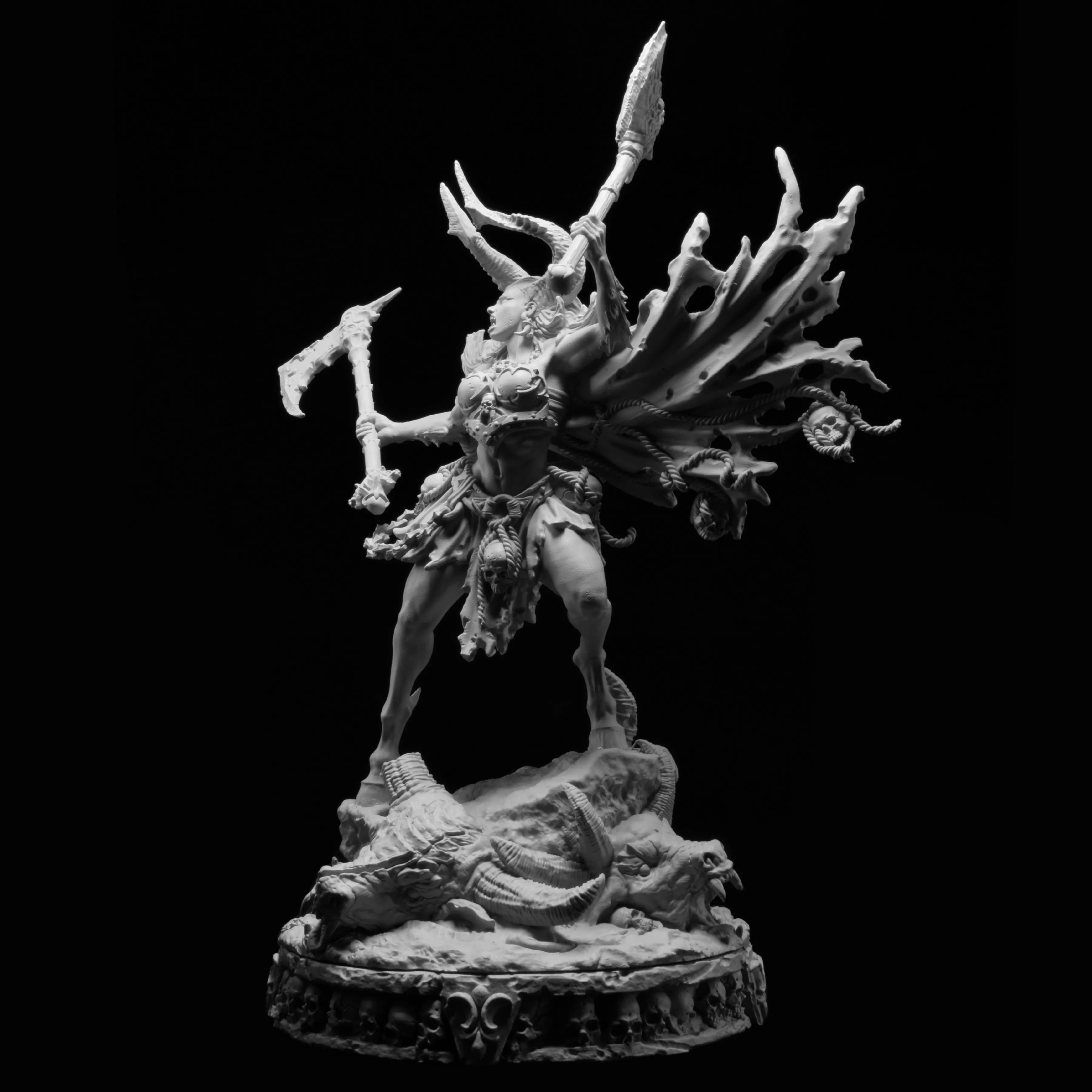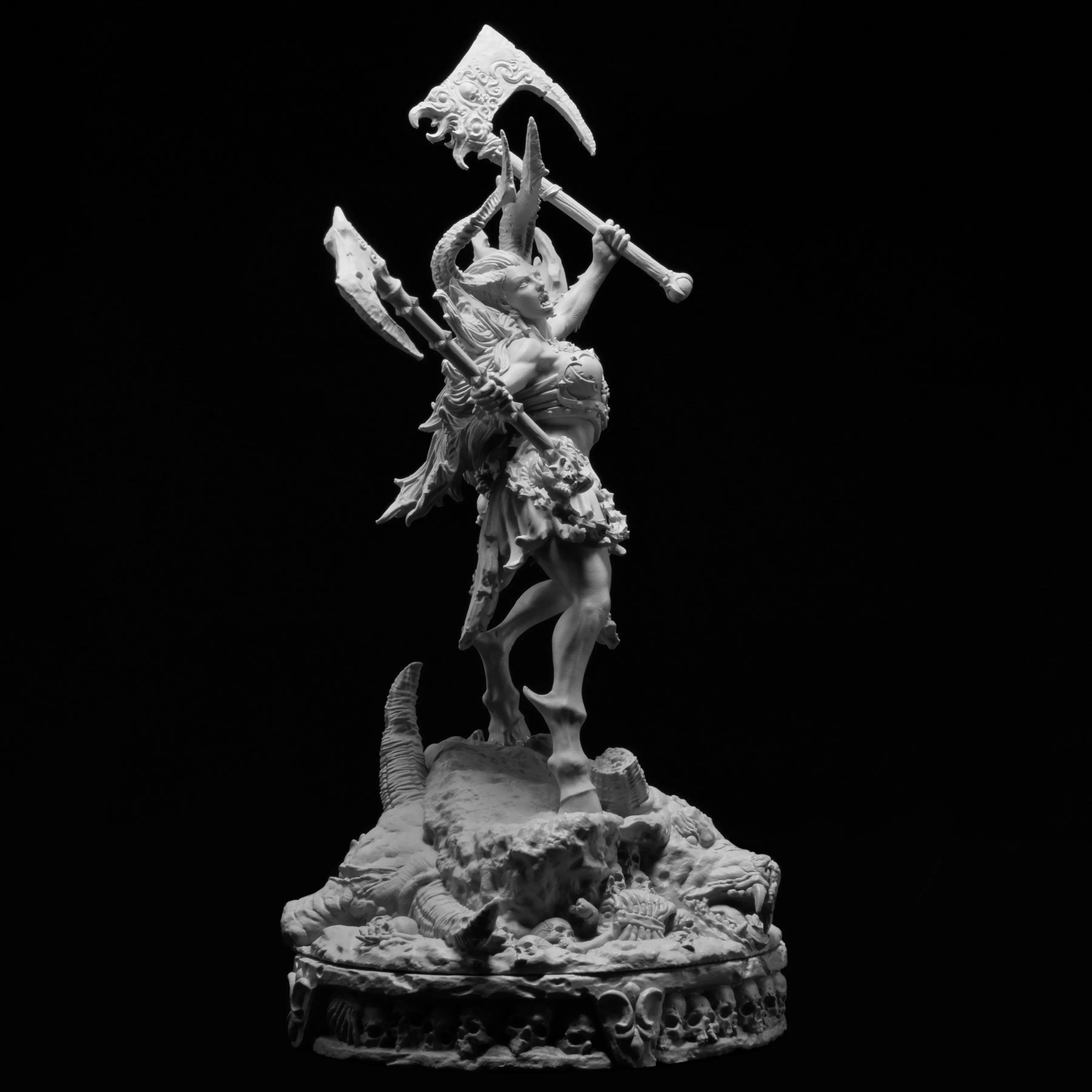 "Standing almost a full three meters in height, Morag conquers everything in her path. She has monster blood in her veins, although no one knows what kind for certain. Her sire is as much of a mystery to her as everyone else. She has the strength of ten men and has been known to cut through armies with the dual battleaxes that she wields. Her heavy, dark horns threaten to pierce the sky. They are the first thing often spotted on the horizon and the last thing a man sees when she charges towards him, head-down. She uses her horns to gore enemies before slicing through them with her blades. No hunter has ever succeeded in taking her down. To all, she appears invincible."