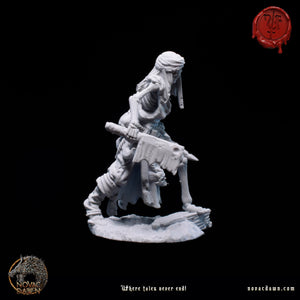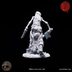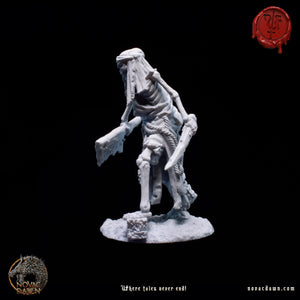 In Raventon, Grimjaw was the feared, corpulent butcher, notorious for his sinister demeanor and insatiable greed. His cleaver, always stained with blood, mirrored his ruthless nature. When famine struck, Grimjaw hoarded meat, letting villagers starve. One night, desperate townsfolk confronted him, but he fought back savagely. Overpowered, he met a brutal end. Now, as an undead butcher, Grimjaw roams the village at night, his skeletal frame a haunting reminder of his greed and cruelty.