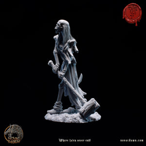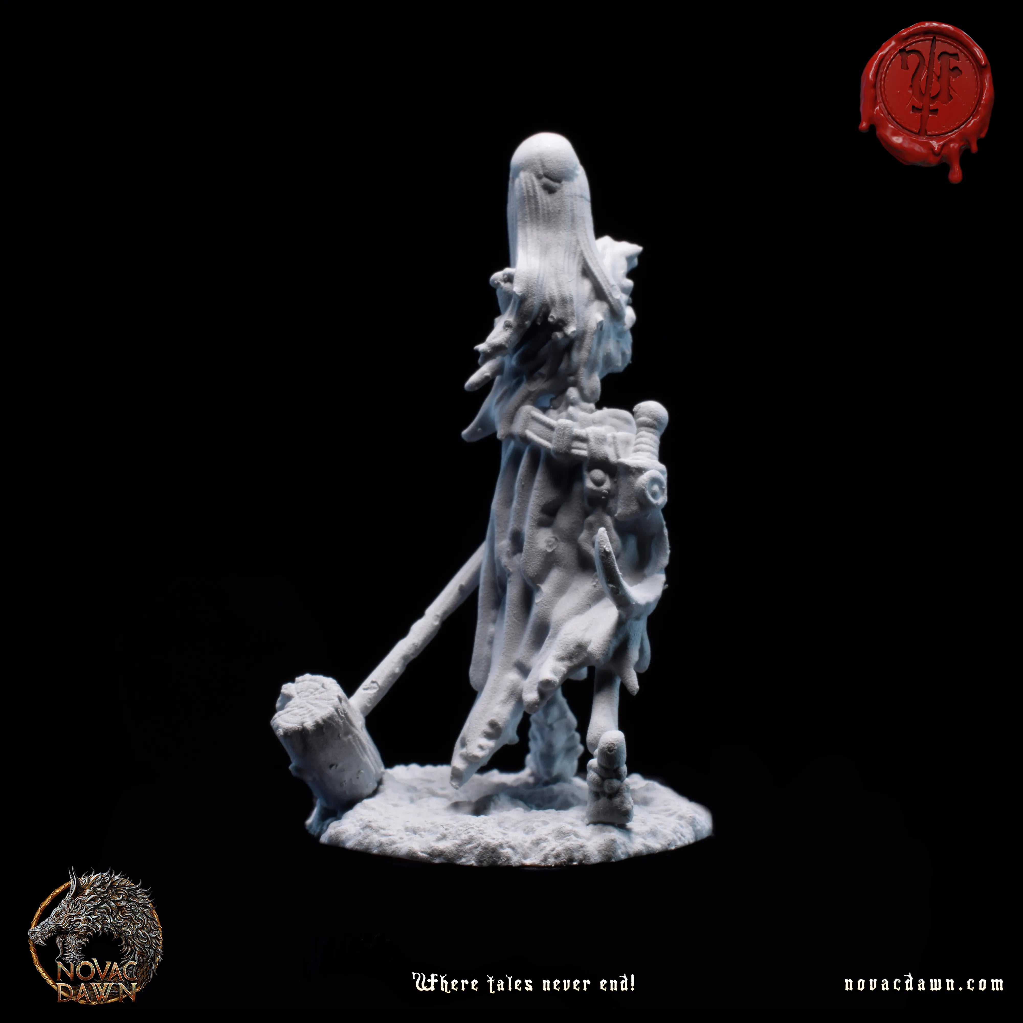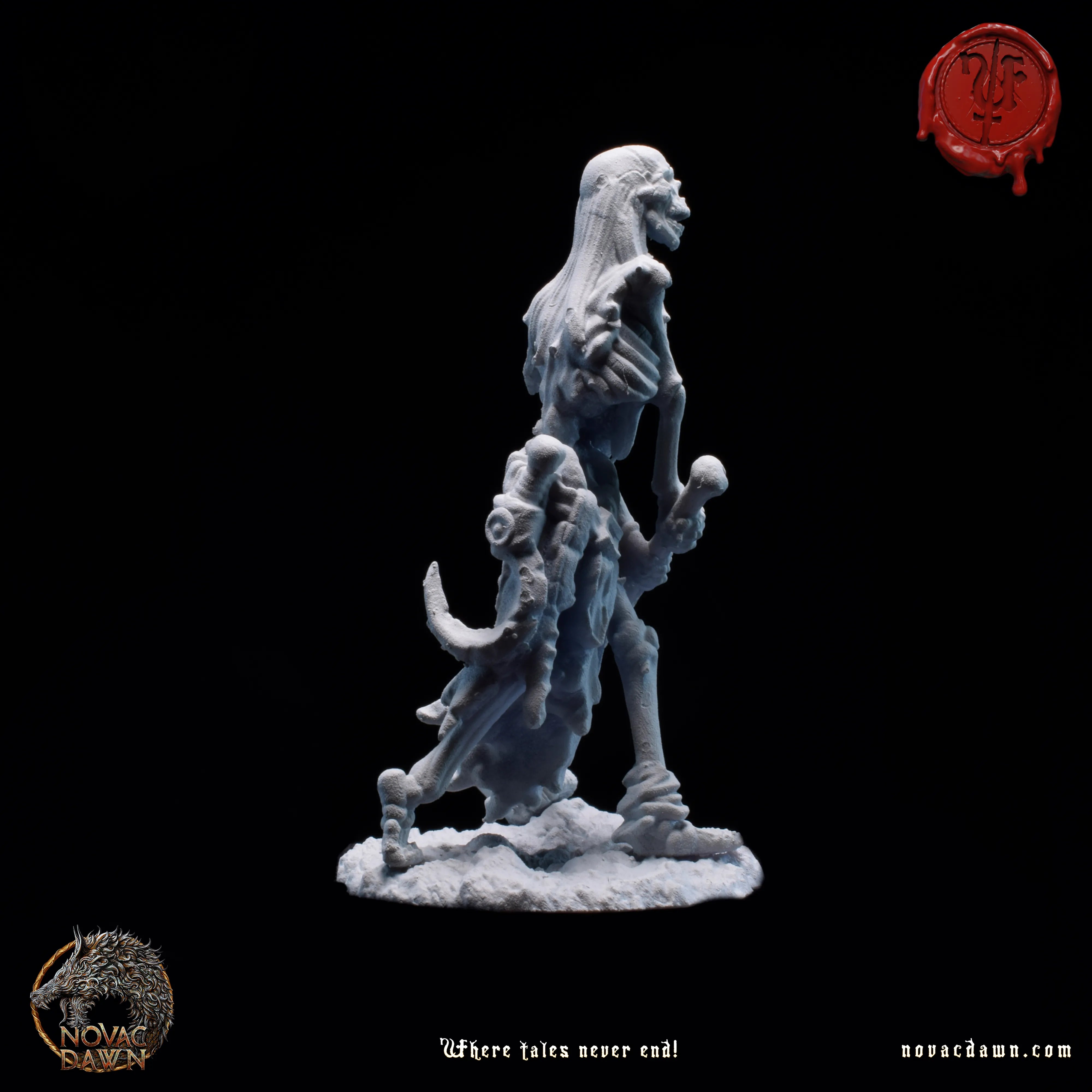 In life, Rendrak was the village blacksmith of Raventon, renowned for his strength and craftsmanship. He forged tools and weapons with unmatched skill, providing for his family and community. When famine and disease struck, Rendrak's strength waned, and desperation took hold. Malachi, the necromancer, offered a grim pact that Rendrak accepted in a moment of hopelessness. Now, as an undead guardian, Rendrak wields a massive hammer, the tool of his former trade, twisted by dark magic. His skeletal form, draped in tattered rags, roams the crypts, driven by a faint memory of his past life and bound eternally to the Bone Reapers.