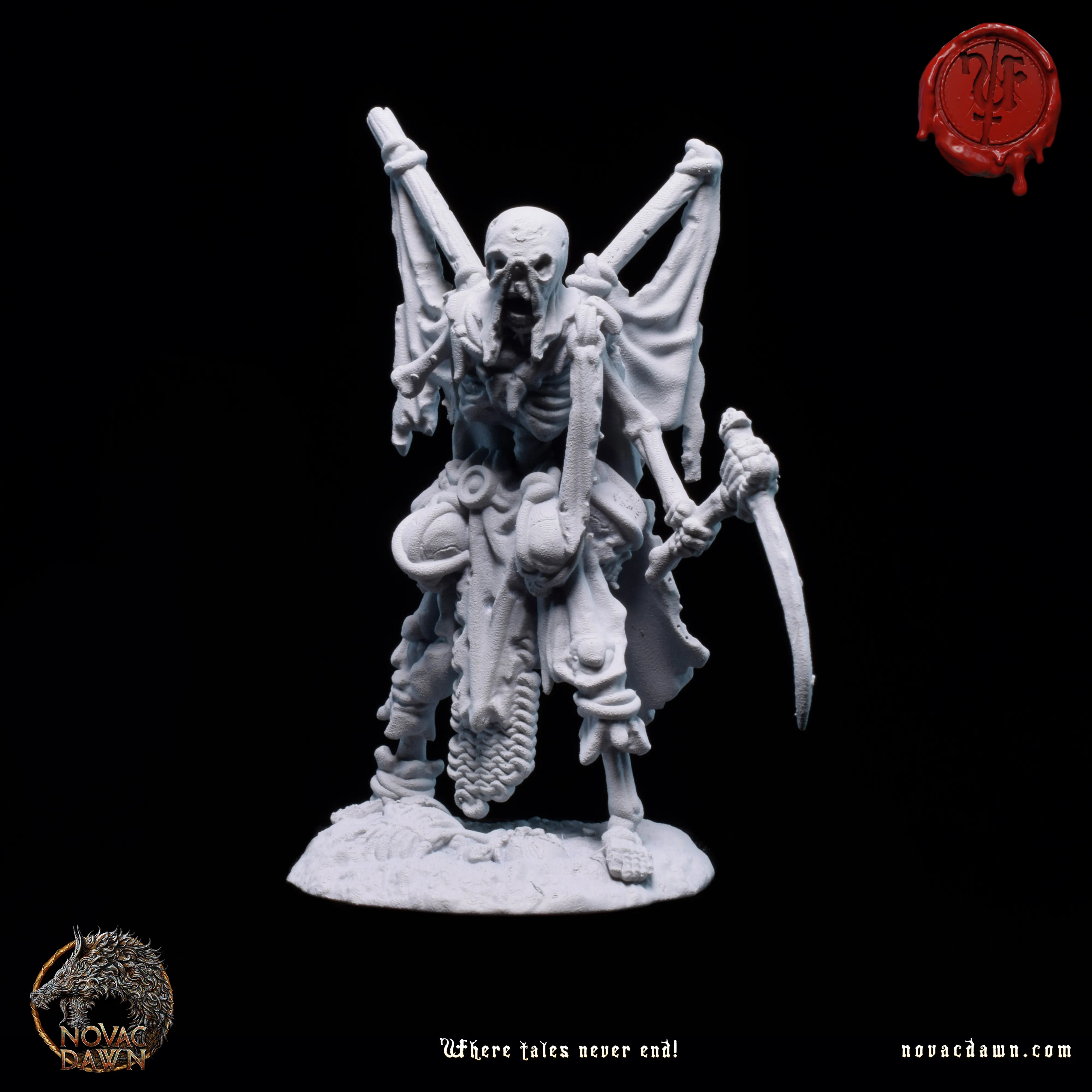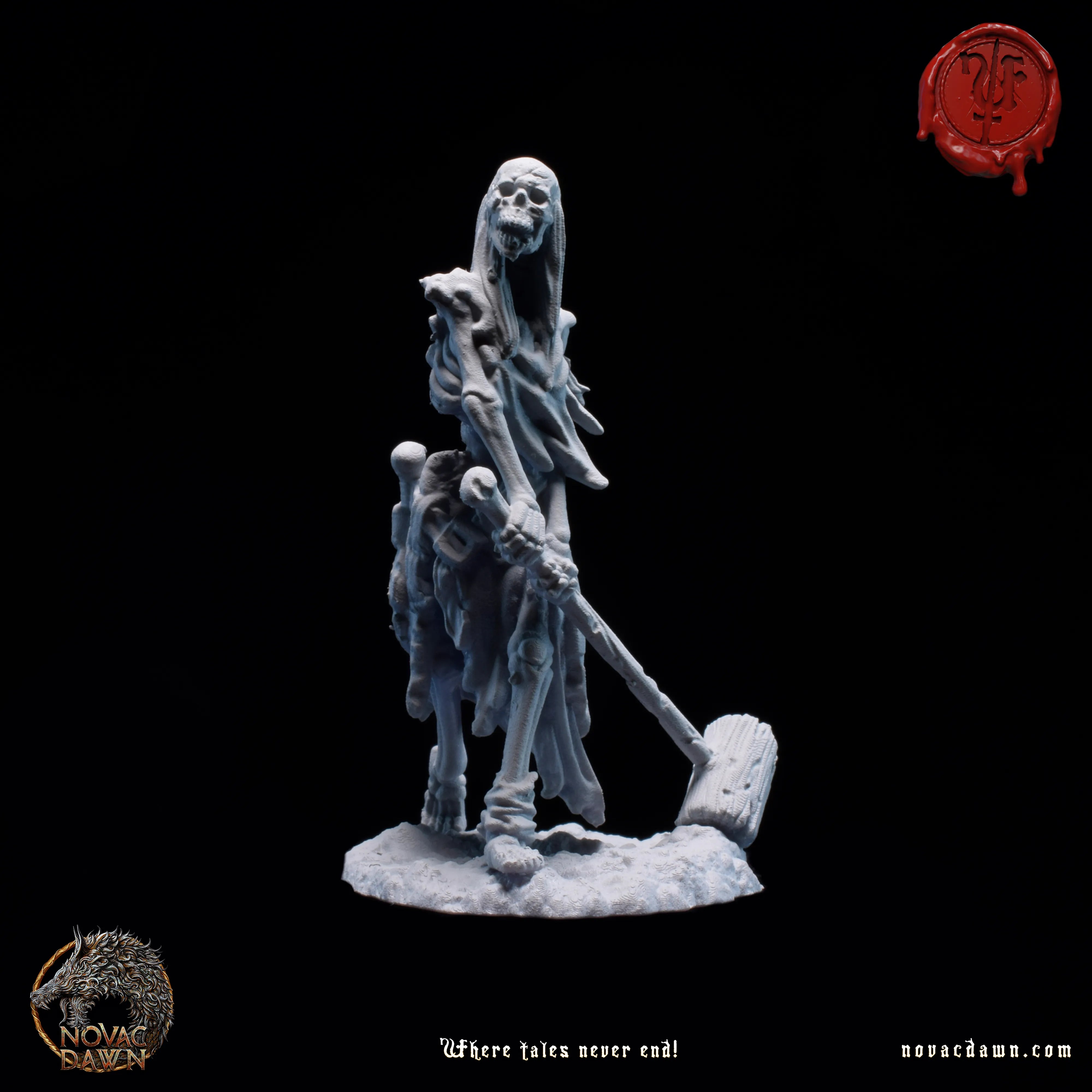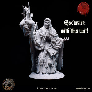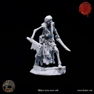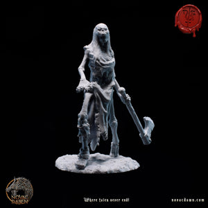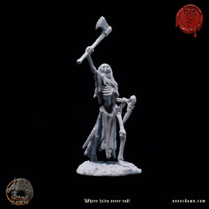 In the once-thriving village of Raventon, famine and disease drove the desperate peasants to accept a grim pact with Malachi, a wandering necromancer. His dark rituals transformed them into skeletal warriors, their farming tools twisted into crude weapons. Now a skeletal figure himself, Malachi, the Summoner, commands them with a staff of twisted bone and unyielding authority. Leading them is Thalric the Bonebreaker, a towering skeletal figure draped in tattered remnants of his former life. His eyeless skull is shrouded by a hood, and in his left hand, he holds tightly to his right arm, which he ripped off to gain a longer reach with his trusted cleaver. The Bone Reapers march across the land, leaving a trail of fear and desolation in their wake.