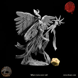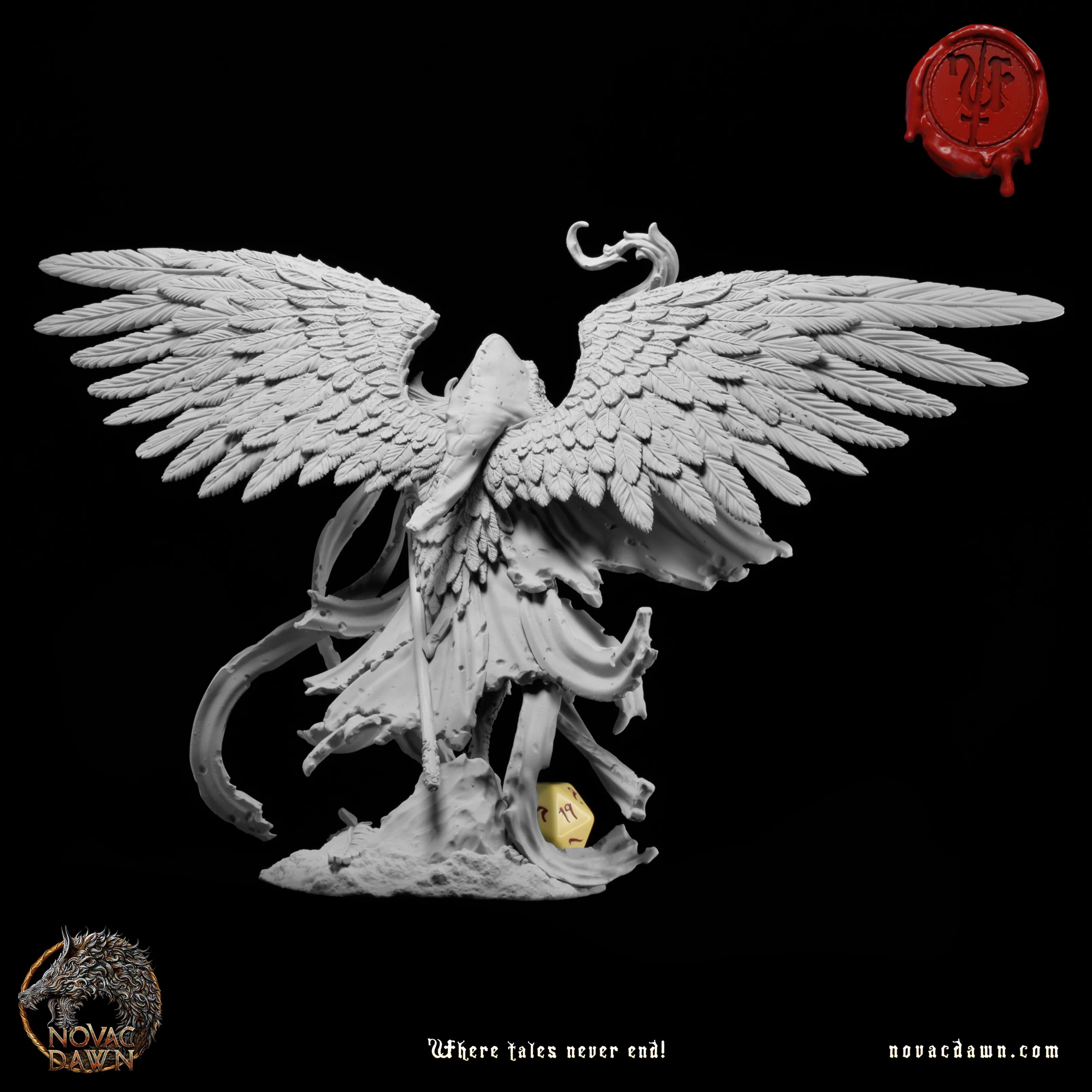 "A thread of lightning trails across the sky, turning the bellies of dark storm clouds pale. Through the smoke and the vapor a figure appears, a striking silhouette of dark wings and white skin. The people know Vilmanté and they cower underneath her as if she casts the shadow of death itself. She flaps her wings only once before diving through the air. She seems to have no face–only a mask that resembles a vulture’s snapping beak. She descends towards her quarry wielding a deadly scythe, prepared to drive it through his stomach and hoist him into the air. She opens her mouth at the same time to unleash a battle cry, and the shrill sound rattles the very earth. "